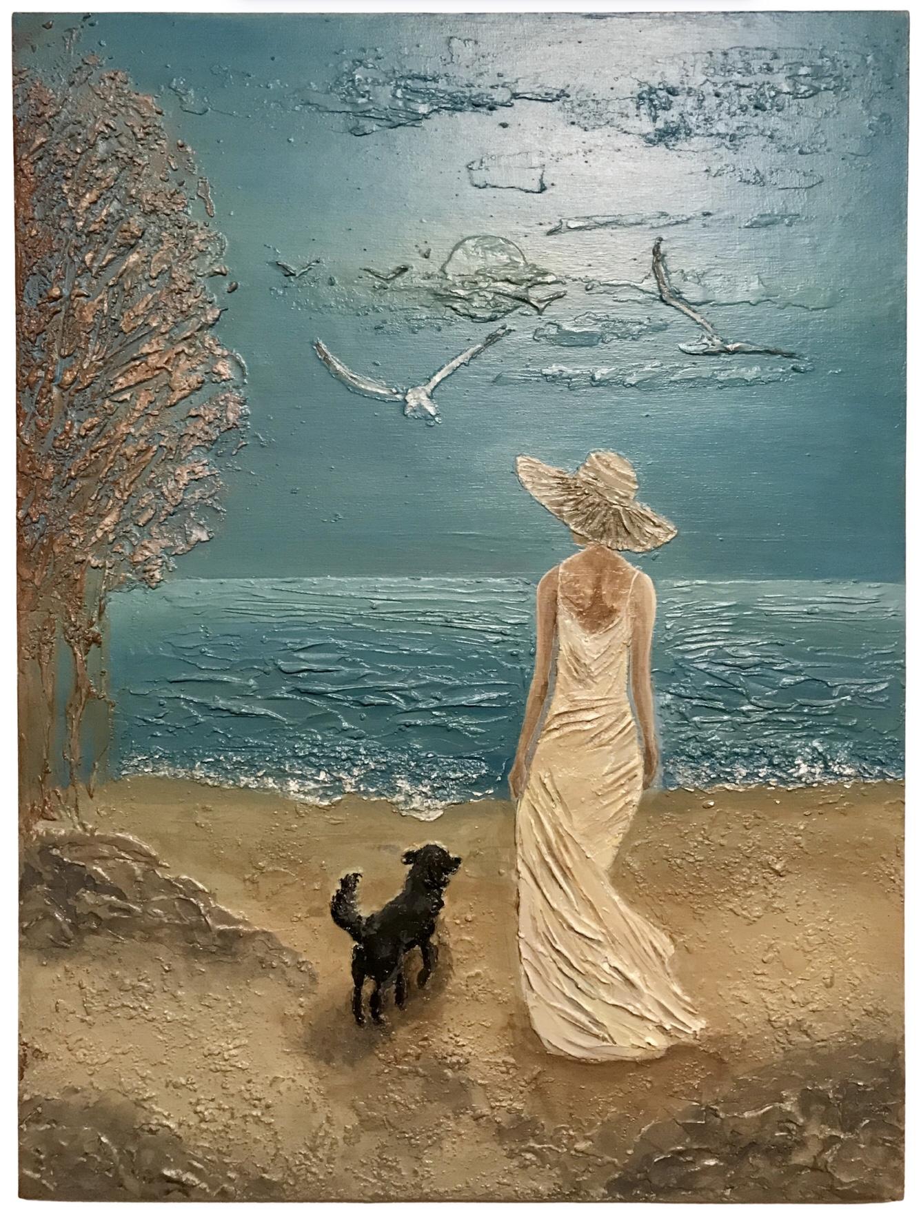 A nő alakja nem portré, hanem érzet. A tenger nem háttér, hanem tér. A fekete kutya nem motívum, hanem kapcsolat. A kép nem hierarchiát teremt ezek között, hanem egyensúlyt: ember, állat és természet egyetlen nyugodt rendszerként léteznek benne.