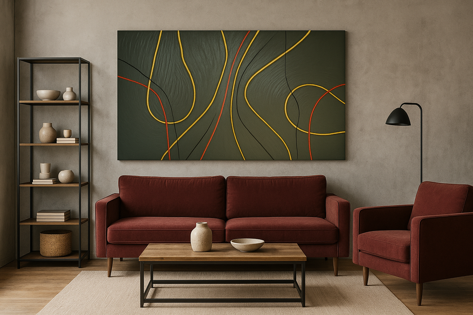 - Japandi enteriőrben a festmény organikus mozgása finoman kapcsolódik a természetes fa, len és kő anyagokhoz, a tér nyugalmát belső harmóniával erősítve.