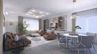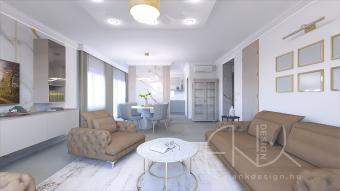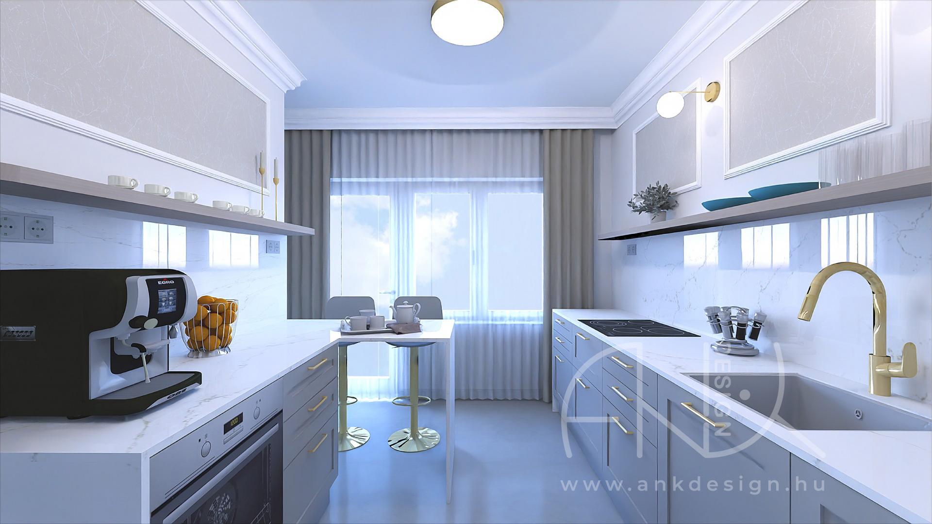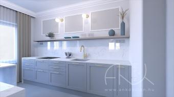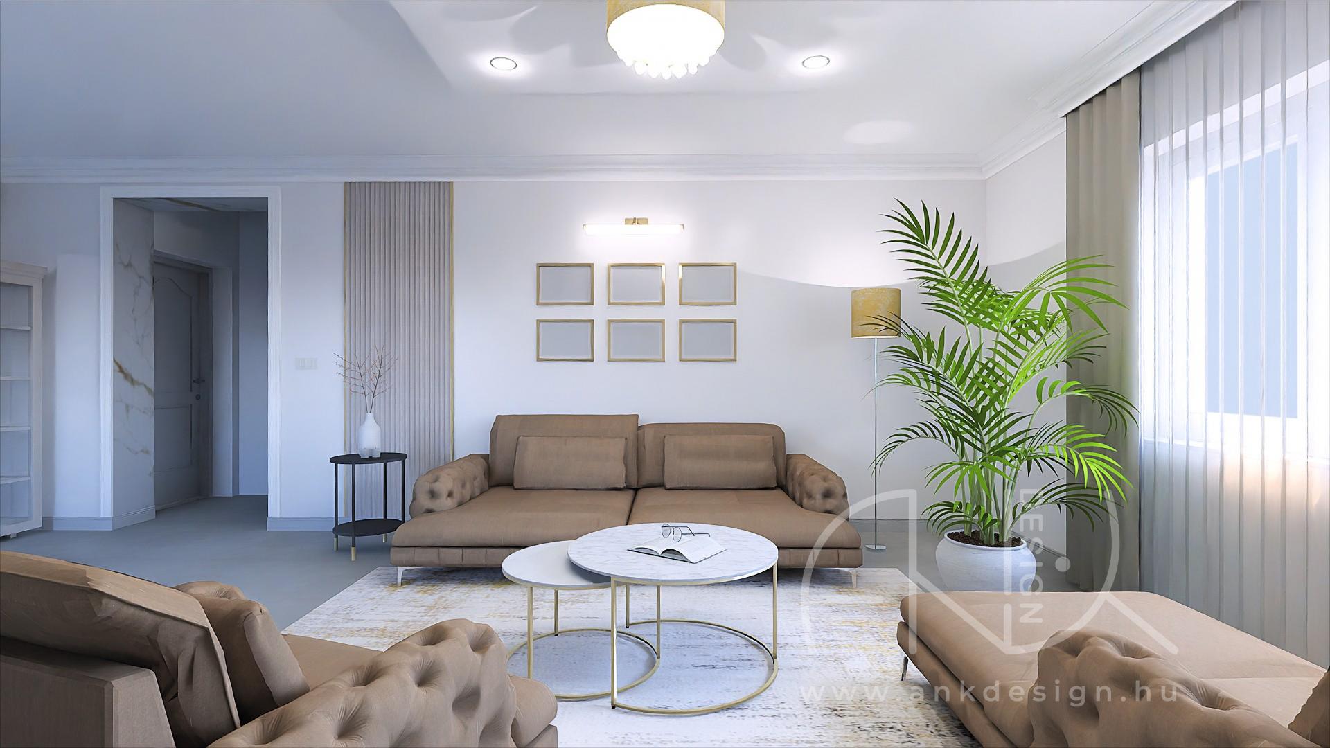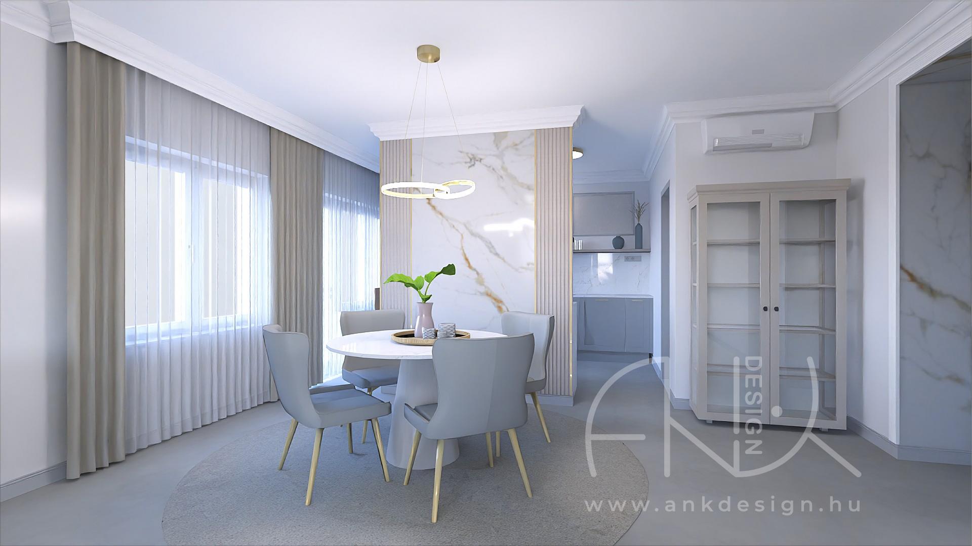 A semleges tónusok, a márványhatású részletek és az arany kiegészítők finom ritmust adnak a térnek, miközben a textúrák és anyagok együttese nyugodt, egységes hangulatot teremt.